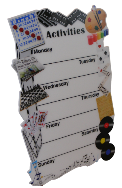 We are all used to knowing what's going on so that we can make our own decisions about what we can do and when. Our weekly activity board are eye-catching in a way to keep everyone informed and provides actitity co-ordinators with the ability to communicate daily acativities in any setting. Created specifically for those living with Dementia in mind, this design is highly visible and visually attractive.