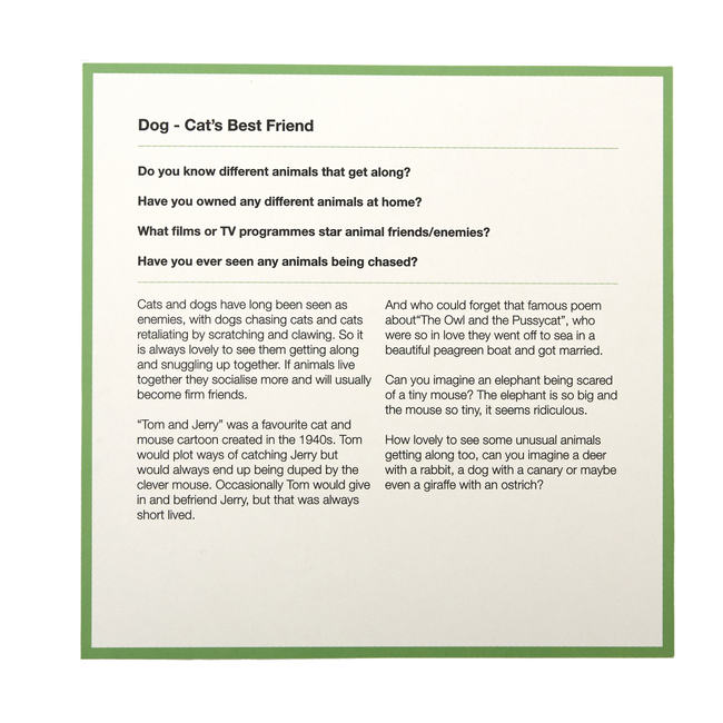 Whether an individual with dementia has fond memories from time spent with their pet at home, or visiting a petting zoo, this reminiscence activity has been designed to prompt conversation around the theme of animals.